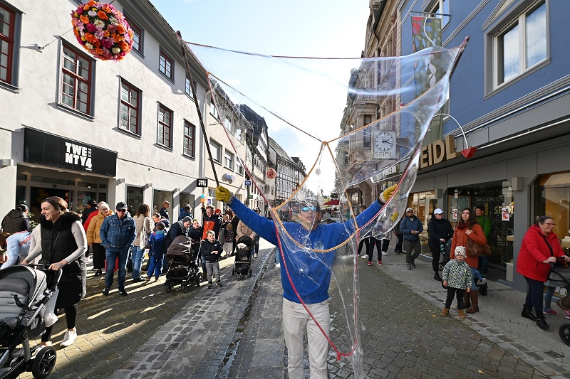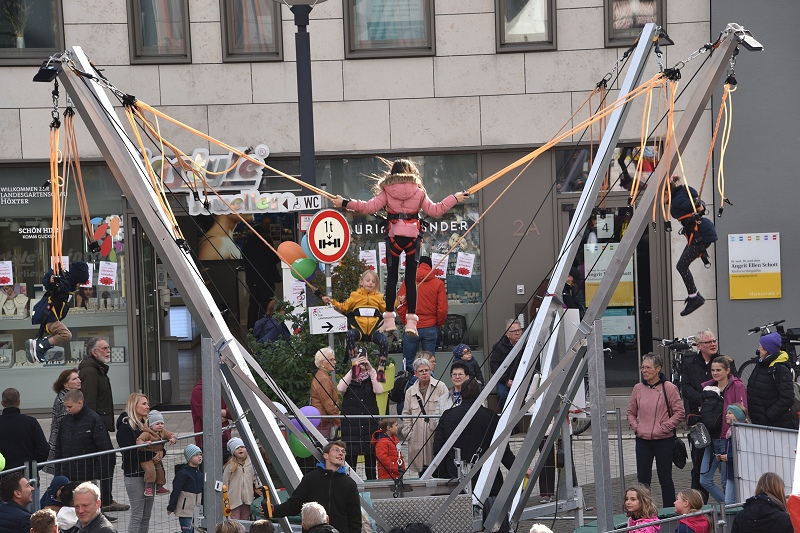 Ihre eigene Premiere feierte die Höxteranerin Lydia Dabringhausen als „Frau Holle“ beim gleichnamigen Märchenspiel vor der Dechanei. Sie ist die Nachfolgerin von Marianne Fien, die vom ersten Märchensonntag an, 27 Jahre lang die Frau Holle gespielt hat. Gut angekommen und viel Applaus erntete auch das von der Theater-AG des Petri-Ganztags aufgeführte Stück „Hänsel und Gretel“. An jeder Ecke war der verkaufsoffene Sonntag einfach märchenhaft. Gespannt lauschten die Kinder den Märchenerzählungen, schauten gespannt zu, wie der Kiepenkasper und Castellos Puppentheater dem Kasper und den anderen Märchenfiguren Leben einhauchte oder aber beteiligten sich am Bemalen der für den Verkehr gesperrten Westerbachstraße mit Kreide und beim zaubern von märchenhaft großen Seifenblasen. Walking Acts haben das Programm des 28. Märchensonntags der Werbegemeinschaft Höxter e.V. abgerundet und für das Speed Stacking begeisterte der MTV Boffzen die zahlreichen kleinen und großen Besucherinnen und Besucher, von denen wieder einmal tausende in Höxters Innenstadt strömten.