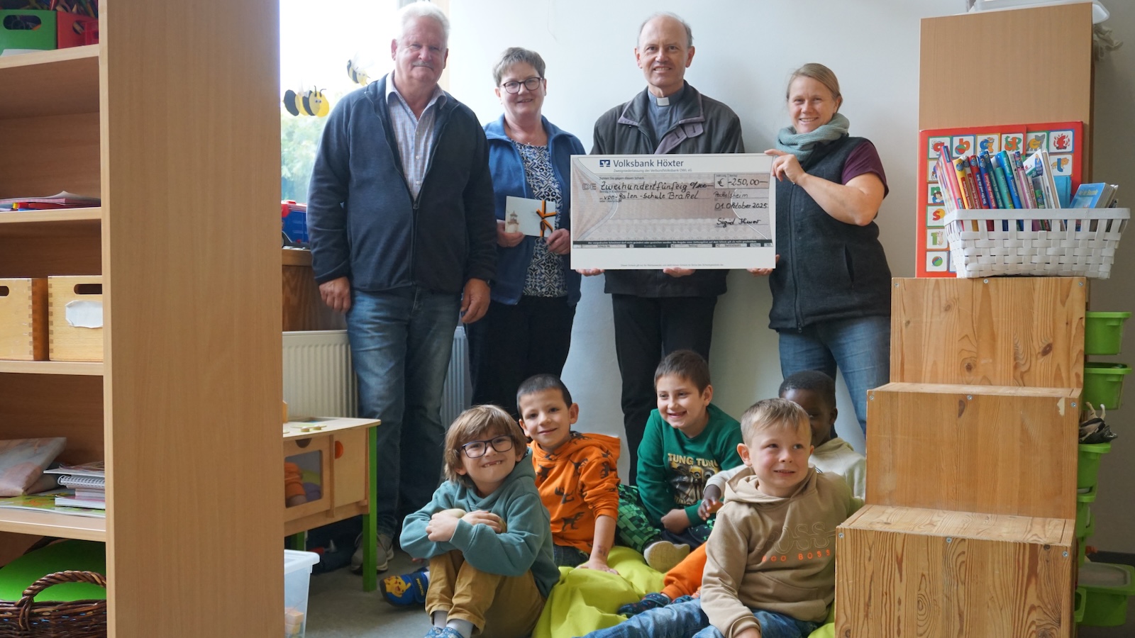 Frohenhausen (red). Freudiger Besuch hatte sich in der von Galen-Schule in Brakel-Frohnhausen angekündigt. Sigrid (1. Vorsitzende) und Hartwig Ihmor (Kassierer) sowie Präses Ullrich Birkner von der Kolpingfamilie Peckelsheim waren in der vergangenen Woche zu Gast. Mit im Gepäck war eine großzügige Spende für die Schülerinnen und Schüler für ein schönes Projekt.