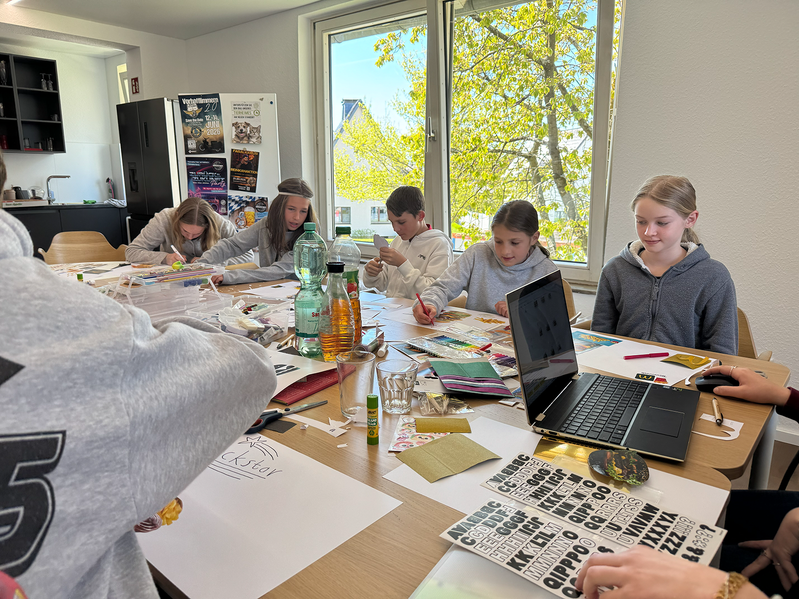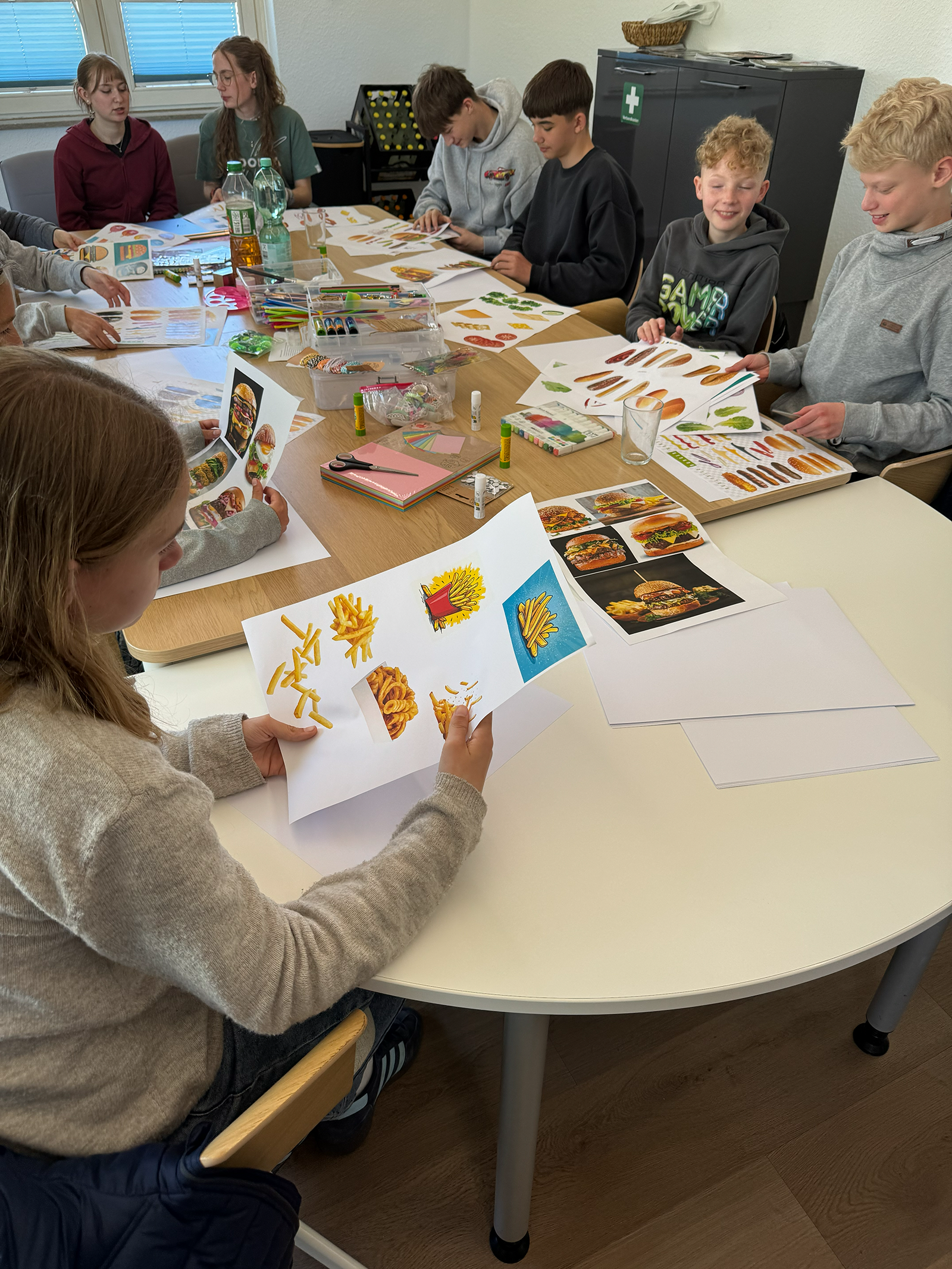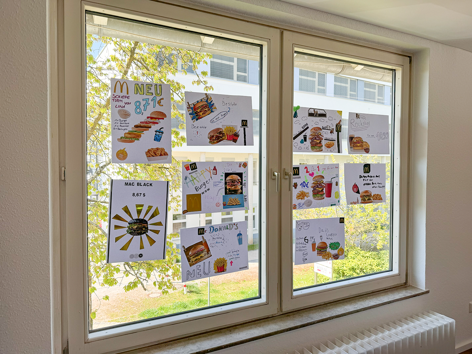 Nach einer kurzen Pause stand der gestalterische Teil des Zukunftstags auf dem Programm. Gemeinsam mit Juliane Grimme und der Auszubildenden Sofiia Zhyzhmarova entwarfen die Schülerinnen und Schüler Plakate für McDonald’s, auf denen sie ihre Lieblingsburger in Szene setzten. Dabei entstanden sehr unterschiedliche Ideen: von nachgestellten Burger-Motiven über selbst erdachte Sprüche bis hin zu Zeichnungen und Verzierungen mit Glitzer und Konfetti. Zum Abschluss wurden die Arbeiten vorgestellt.